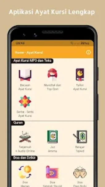 بالإضافة إلى التلاوات، يوفر التطبيق أيضًا النص العربي والترجمة باللغة الإندونيسية، بالإضافة إلى التفسير لآية الكرسي. يمكن للمستخدمين أيضًا استكشاف ميزات مختلفة أخرى، بما في ذلك التفاصيل الكاملة حول آية الكرسي، القرآن الكامل مع الصوت عبر الإنترنت، تعلم التجويد، الصلوات اليومية، الصلوات بعد الصلاة، صلوات الأنبياء، 40 دعاء ربنا، ذكر بعد الصلاة، ذكر الصباح والمساء. يتميز التطبيق بتصميم بسيط وسهل الاستخدام، مما يجعل التنقل والاستخدام سهلين.